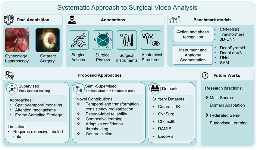 Abstract: Advances in surgical video analysis are transforming operating rooms into intelligent, data-driven environments. Computer-assisted systems now support the full surgical workflow, from preoperative planning to intraoperative guidance and postoperative assessment. However, developing robust and generalizable models for surgical video understanding remains challenging due to (I) annotation cost and scarcity, (II) spatiotemporal complexity, and (III) domain gap across procedures and institutions. This doctoral research aims to bridge the gap between deep learning–based surgical video analysis in research and its real-world clinical deployment. To address the core challenge of recognizing surgical phases, actions, and events, critical for video-based analysis, I benchmarked state-of-the-art neural network architectures to identify the most effective designs for each task. I further improved performance by proposing novel architectures and integrating advanced modules. Given the high cost of expert annotations and the domain gap across surgical video sources, I focused on reducing reliance on labeled data. We developed semi-supervised frameworks that improve model performance across tasks by leveraging large amounts of unlabeled surgical video. We introduced novel semi-supervised frameworks, including DIST, SemiVTSurge, and ENCORE, that achieved state-of-the-art results on challenging surgical datasets by leveraging minimal labeled data and enhancing model training through dynamic pseudo-labeling. To support reproducibility and advance the field, we released two multi-task datasets: GynSurg, the largest gynecologic laparoscopy dataset, and Cataract-1K, the largest cataract surgery video dataset. Together, this work contributes to robust, data-efficient, and clinically scalable solutions for surgical video analysis, laying the foundation for generalizable AI systems that can meaningfully impact surgical care and training.